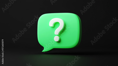 green 3D speech bubble with a white question mark in the center, placed against a solid black background. The minimalistic and bold design emphasizes inquiry, questions, and communication