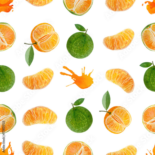 Green and orange tangerine and color splash watercolor seamless pattern isolated on white