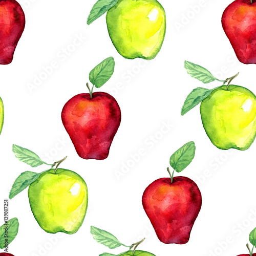 Green and red apples with leaves, seamless pattern design hand painted watercolor illustration
