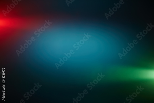 Green and red rays of light around a dark turquoise volumetric cloud of light