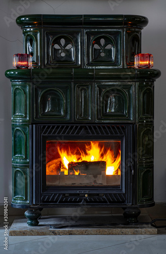 Green antique tile stove. Fire burning in the fireplace. Candles on a tile stove.