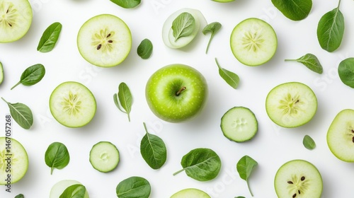 Green apple, cucumber, and spinach flat lay pattern on white background.
