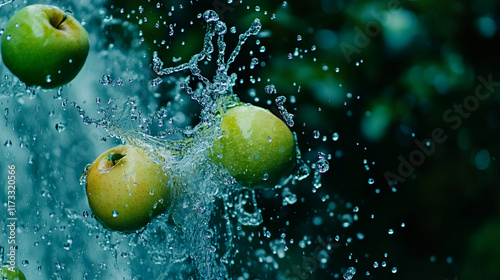 Green apples splashing in water with droplets suspended in motion on a dark background, evoking freshness and energy