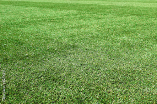 Green artificial grass on the football field. Horizontal view. Background. Texture.