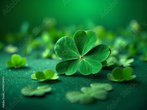 green background happy clover for st. patrick's day, blurred background with sparkles