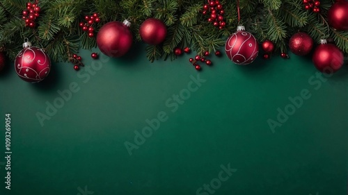 Green background with red Christmas decorations and pine cones with copy space