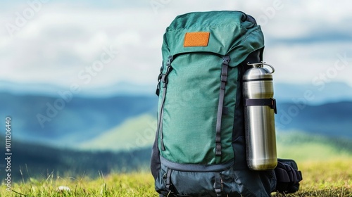 Green Backpack with Water Bottle in Mountains.