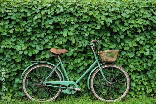 Green bicycle leaned against a dense wall of green leaves, blending harmoniously into the natural landscape. Copy space for text.
