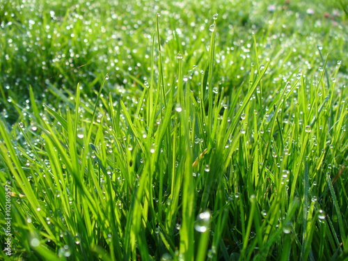 Green blades of grass and water drops of morning dew glowing in sunlight - natural background. Topics: ecology, beauty of nature, blooming, spring, summer, natural environment, season, weather
