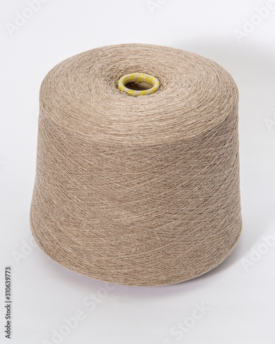 Green bobbin of yarn on a white background.Textile reel on isolated white background.