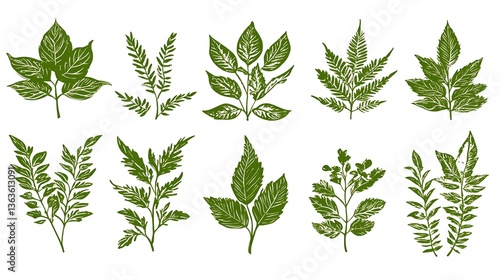 Green Botanical Illustrations Depicting Various Detailed Leafy Plants Designs