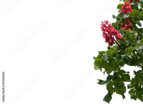 Green branch of chestnut tree (Aesculus carnea) with bright red flowers. Isolated on white background. Free space for text.