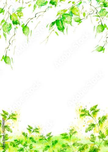 Green branches of birch, linden with leaves. Thickets of wild herbs, garden plants. Watercolor illustration. . For logo, card, design,frame. plants, wild herbs pattern for decoration. Thickets