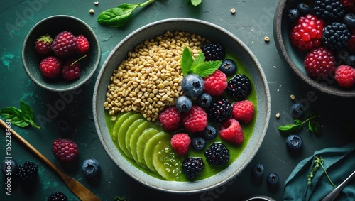 Green Buckwheat, Fruit And Berries Breakfast Bowl. Top View.
