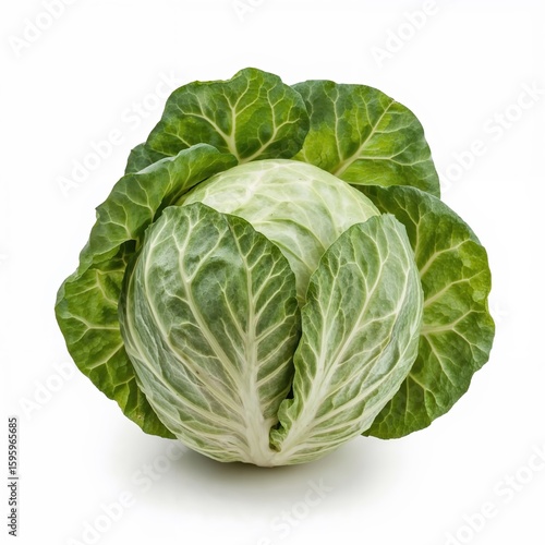 Green cabbage head fresh from the farm with detailed leaves, suitable for recipe cards, diet plans, and healthy food apps