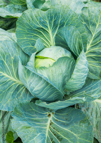 Green cabbage on the farm field. Selective focus. Shallow depth of field.