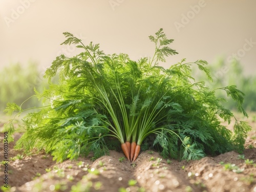 Green carrot crop growing in cultivated field.