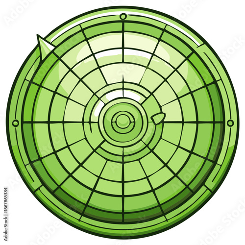Green cartoon radar screen with grid and target blips for detection