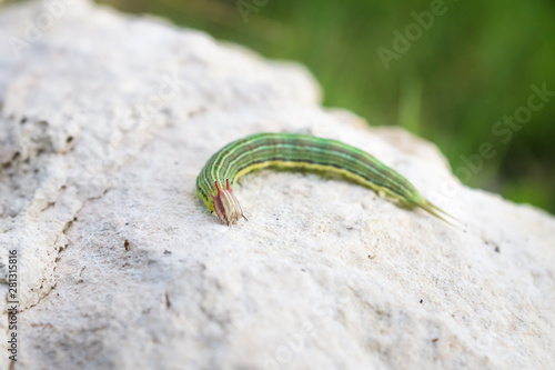 Green caterpillar with yellow stripes, El Remate, Peten, Guatemala