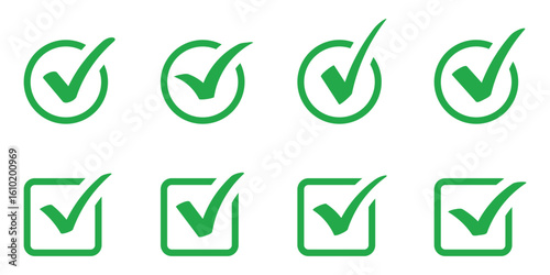 green check mark icon set in circle and square. Tick icon button set. Yes or done symbol, approved or ok icon.
