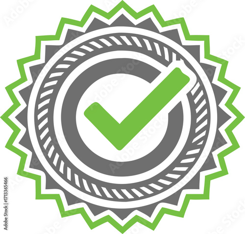 Green check mark inside a gray and white circular seal with a green jagged border on a white background