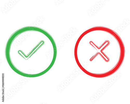 Green checkmark and red X in circles, brushstroke style, isolated on white, simple design, flat digital illustration.