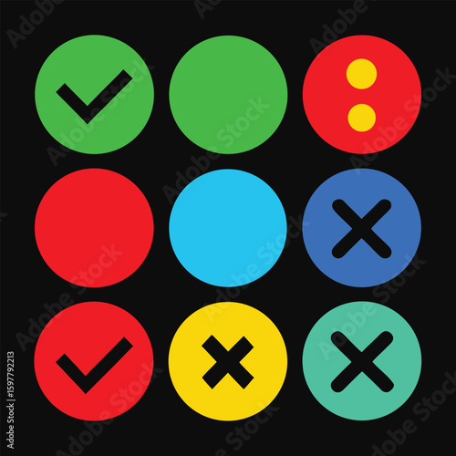 Green checkmark blue cross red circle yellow dots check mark