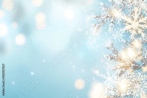 Green Christmas background with defocus lights and blue snowflakes. Abstract background.
