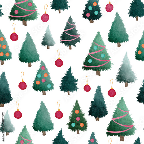 Green Christmas trees with red baubles watercolour painting seamless pattern design illustration on white background
