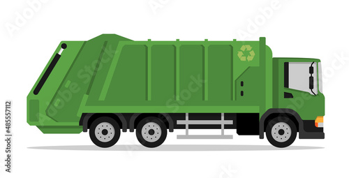 Green city garbage truck in flat style. Industrial machinery and equipment. Collection, sorting and recycling of garbage in city. Isolated vector on white back