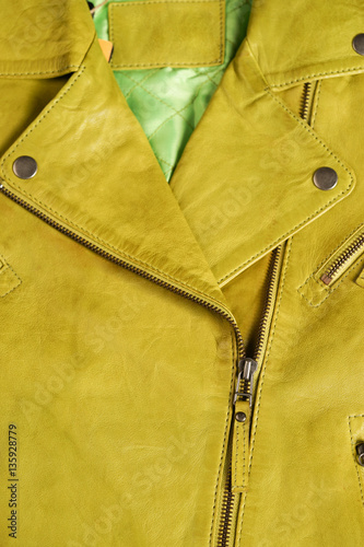 Green color leather jacket. Leather jacket macro details. Jacket zippers and pockets. Lime color leather jacket