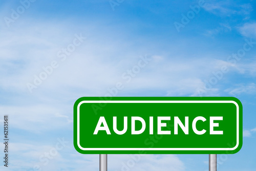 Green color transportation sign with word audience on blue sky with white cloud background