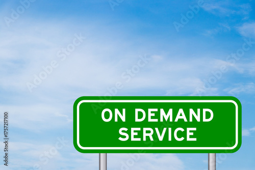 Green color transportation sign with word on demand service on blue sky with white cloud background