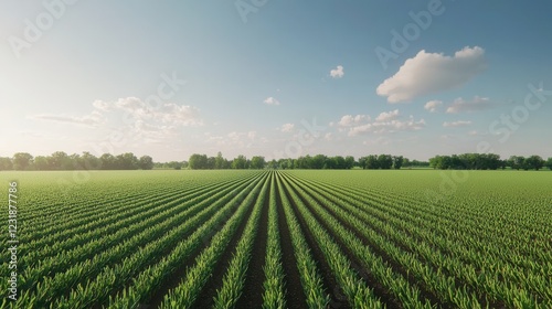 Green Crop Field with Neat Rows Under Bright Blue Sky and Clouds