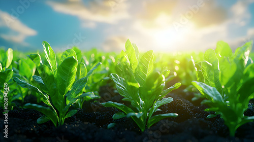 Green Crop Seedlings Growing in Black Soil Under Bright Sunlight in Blue Sky