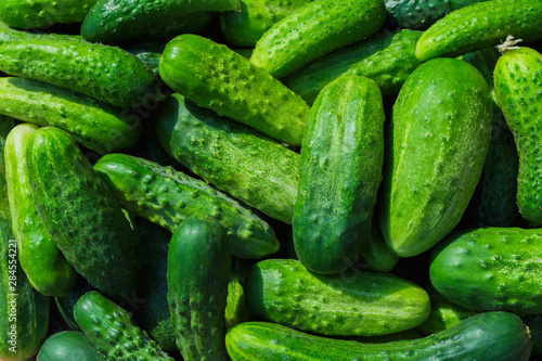 Green cucumbers background. Cucumbers latin name - Cucumis sativus. Fresh cucumbers in the market. Beautiful decor with fresh cucumbers in the form of an even row.