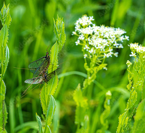 Green Drake Mayfly Ephemera danica male in spring with greengrass field background