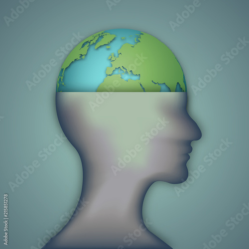 Green earth brain on human head isolated as business, science, ecology idea, intelligent world, paper carve art and craft style concept. vector illustration.