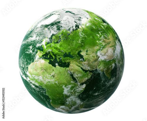 Green earth globe showcasing dense forests and landmass details, cut out transparent