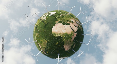 Green Earth Globe with Wind Turbines Against Cloudy Sky Background