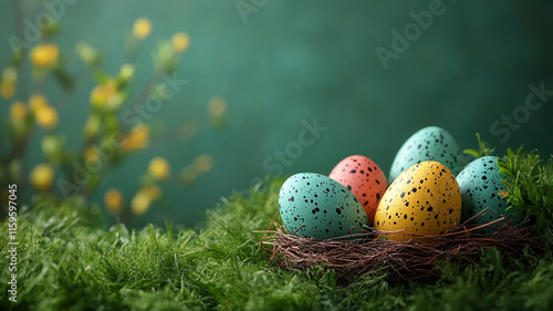 Green Easter background. Easter eggs in the nest. Easter eggs on the green edge.