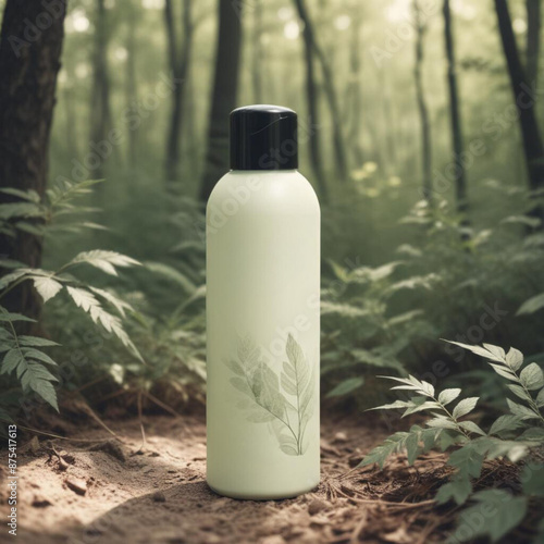 Green eco cosmetic packaging bottle mockup in natural background with green leaves.