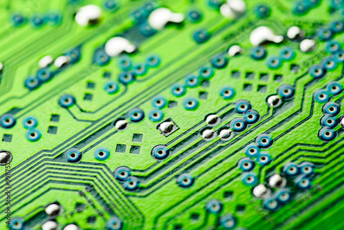 green electronic PCB circuit close-up, microchip CPU and component, selective focus