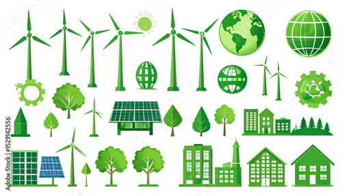 Green energy concept with wind turbine, laptop and glowing world network symbolizing environmental technology and sustainable energy on white background.