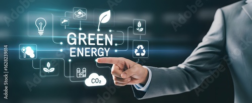 Green Energy Future: A forward-thinking individual interacts with an innovative digital interface, underscoring the promise of sustainability and eco-conscious technology for a brighter tomorrow.