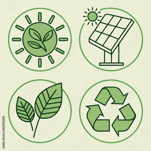 Green energy icons representing sustainability nature solar power and recycling in circular frames