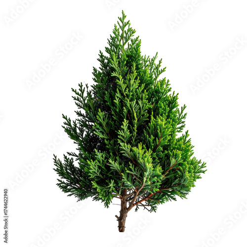 Green evergreen tree with dense foliage, visible trunk, against solid black background