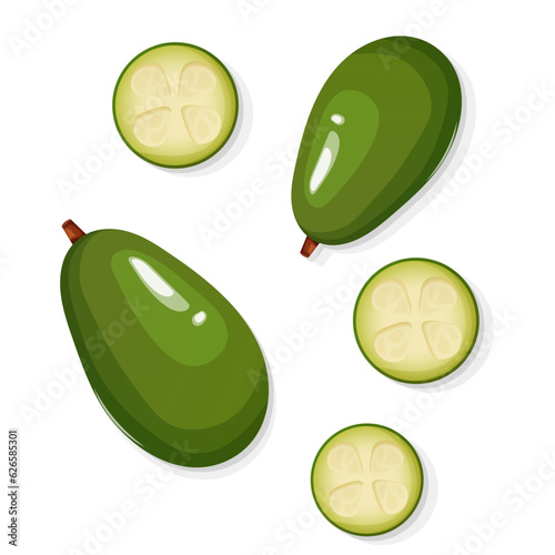Green feijoa. Sliced feijoa. Round pieces of feihua. Flat design vector illustration of feijoa on white background.