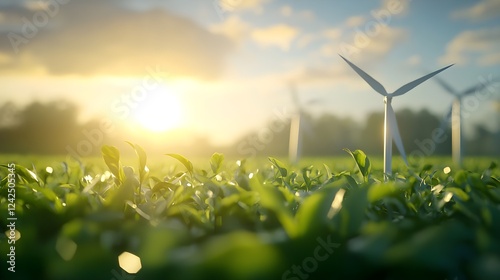 Green Field with Wind Turbines at Sunset