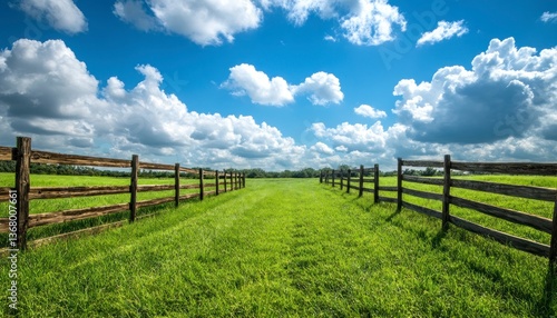 Green Field with Wooden Fence Under Blue Sky with Clouds